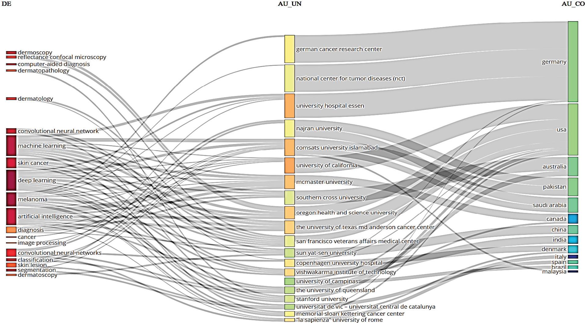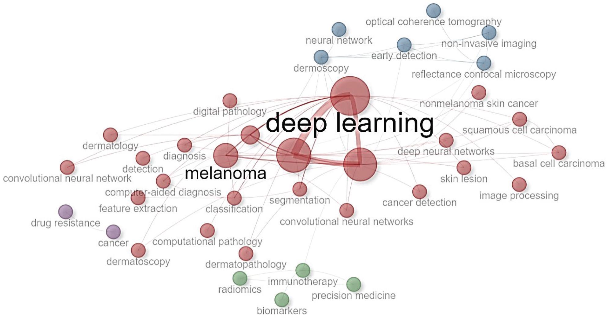 In research publications, a graphical representation (see Figure 2) called the co-occurrence network of author keywords shows the connections between different author keywords. In the same research documents, individual keywords are nodes within these networks and edges that connect these nodes indicate the repeated co-occurrence of such words often. Through the research field or a specific set of publications, these networks highlight essential information by presenting an elastic picture of the underlying relationships. Upon closer examination of Figure 1, it is revealed that Germany, the United States, and Australia prominently emerge as the forerunners in academic endeavors that chronicle the steps made within the artificial-intelligence driven melanoma.