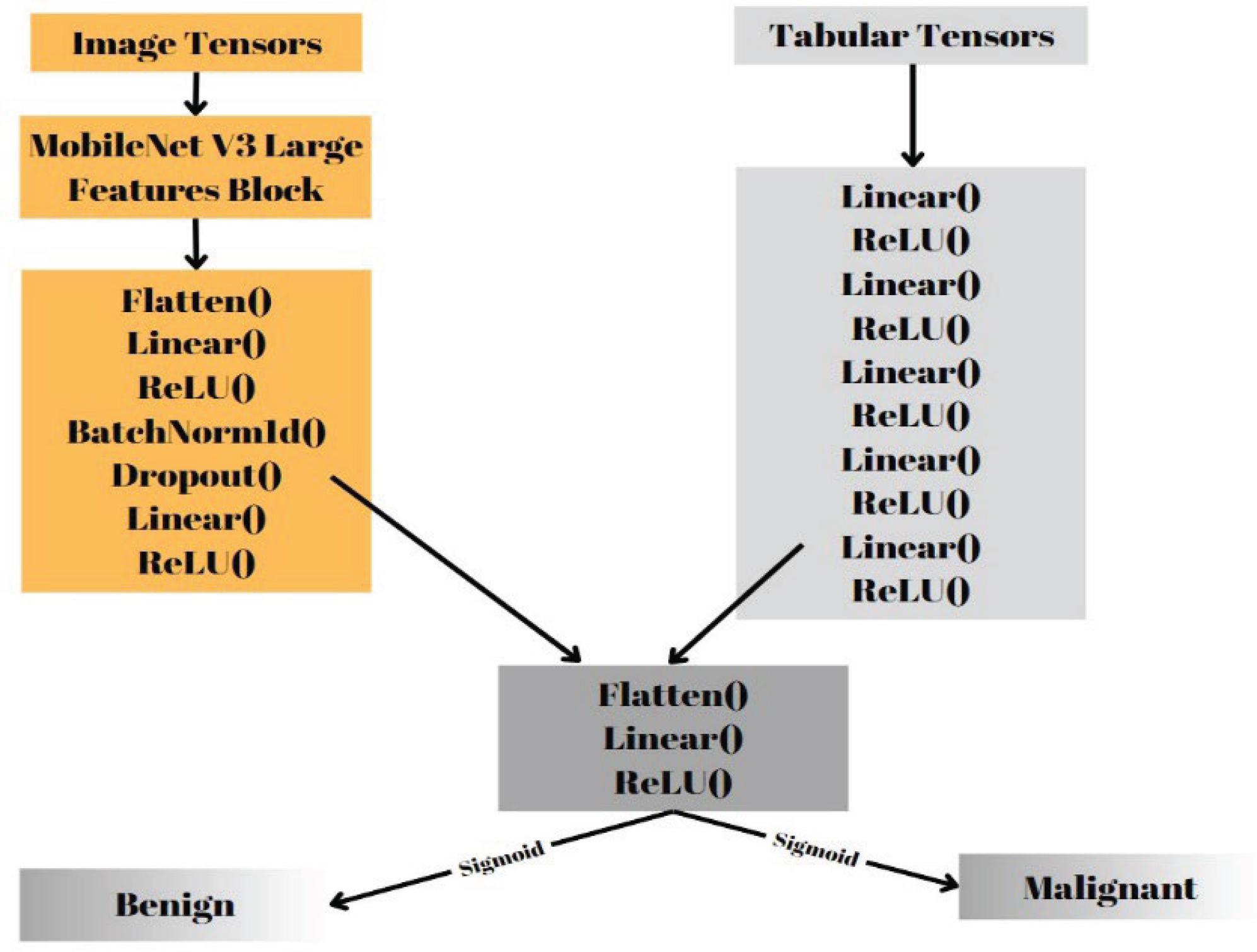 The dataset (Table 2) incorporates both tabular data, which consists of patient demographics (sex, approximate age) and lesion location, and image data characterized by three channels and dimensions of 224×224 pixels. The image data undergoes a sequential process, starting with convolutional layers, followed by batch normalization layers, and then Hardwish activation layers from the MobileNet V3 Large Model’s Feature Block, to extract pertinent features. Subsequently, it passes through linear, batch normalization, and dropout layers to prepare it for classification. Meanwhile, the tabular data undergoes transformations via multiple linear and ReLU layers. These two sets of data are combined and processed through a linear layer. For classification, the combined data then proceeds through a sigmoid activation function and is rounded as final classification.