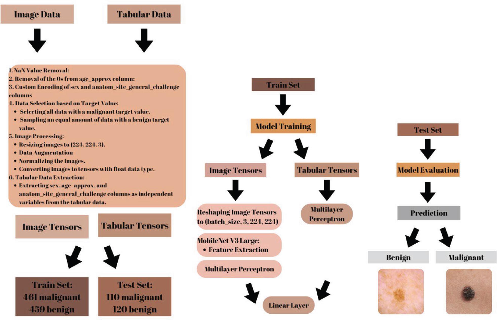 Concurrently, ‘sex’, ‘age_approx’, and ‘anatomical_site_general_challenge’ are extracted as independent variables from the tabular data. The Image Tensors and Tabular Tensors are then utilized to train the model. The Image Tensors are processed through an MobileNet V3 Large model for feature extraction, while the Tabular Tensors are processed through a Multilayer Perceptron. The training process involved iteratively optimizing the model parameters using the Adam optimizer with a learning rate of 0.01.