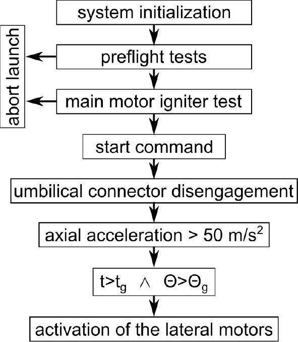 The state machine (Figure 3) was also used to realize a step-by-step control process to prevent too-early lateral motor firings for safety reasons. The actuation unit with the control motors might be activated only after detecting the launch event (longitudinal acceleration of more than 50 m/s2 over 0.4 s).