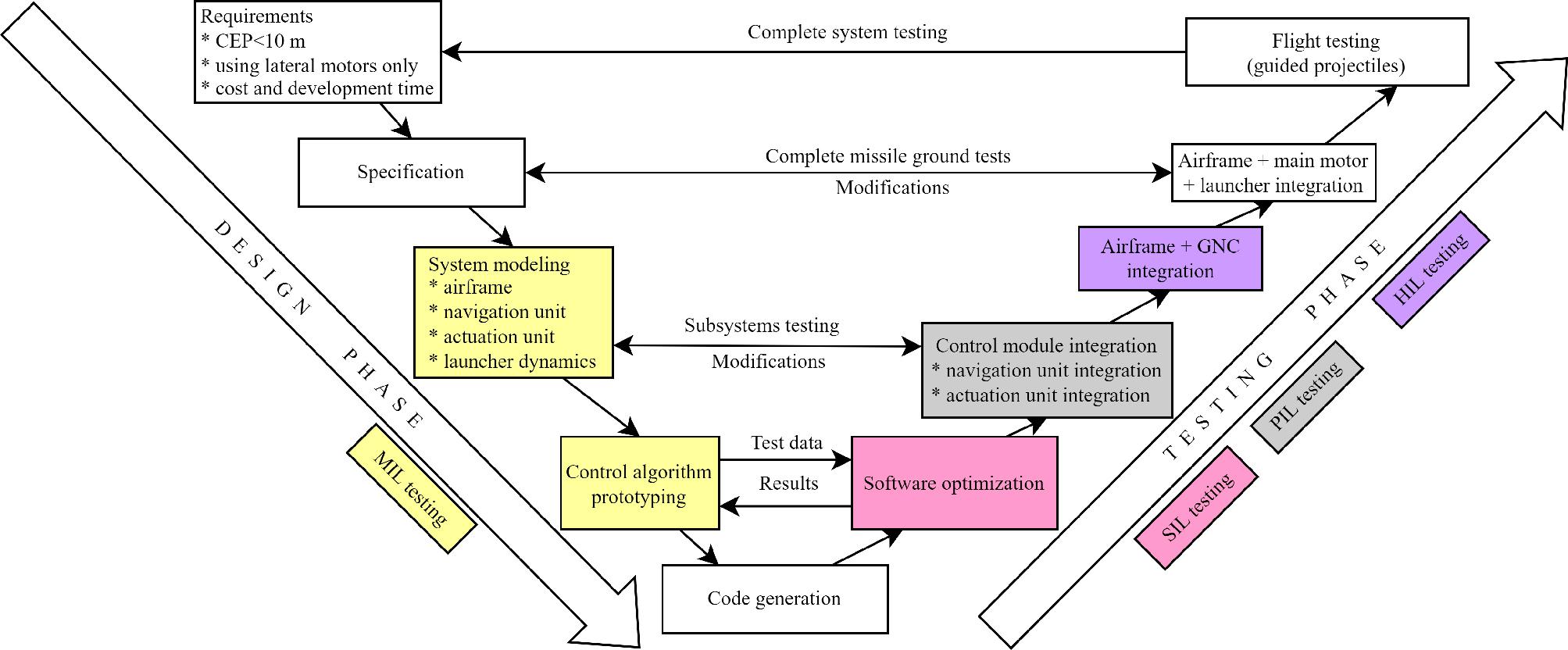 In the field of guided UAVs, the literature related to MBD is relatively scarce. Among the detailed publications, one might mention the work of Putro and Septanto [57], who developed a real-time test environment for evaluating the missile’s performance. Craft [13,14] presented the case of using automatic code generation for the Long Range Land Attack Projectile (LRLAP). Abdelaty [1] gave a comprehensive description of the autopilot development for the anti-tank round. Tancredi [65] described the overall design methodology, and reported using code generation by MBDA company but without describing a particular case. Holliday [27] reported using MBD by Thales company and presented several user cases, however, without sufficient detail. Several authors briefly described Hardware-in-the-Loop simulators for guided high-speed objects [4,36,61,76], but the results are difficult to reproduce. Waxenegger [68] presented a Hardware-in-the-Loop testing methodology for a rocket propulsion control system.