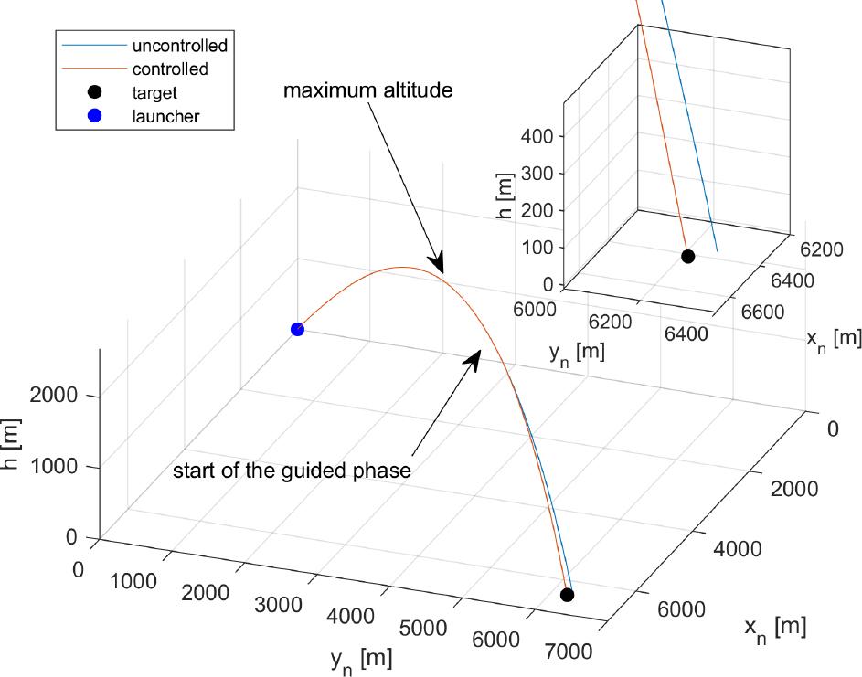MATLAB R2023 with Update 5 was used to perform numerical simulations. The control algorithm was improved step by step, iteratively. Several iterations of MIL, SIL, and PIL simulations were evaluated to meet the acceptance criteria. The solution was acceptable if the impact point dispersion measured using Circular Error Probable 50% (CEP50%) was smaller than 25 m and the results were repeatable for various flight scenarios. Here, the selected example of a mission scenario is presented.