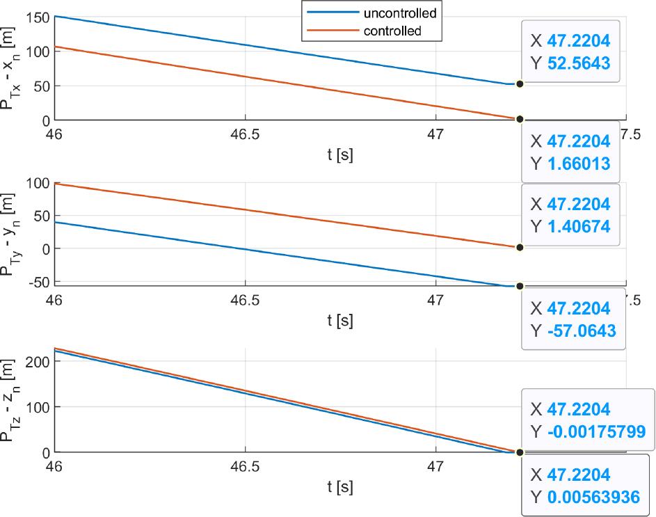 For the controlled one, the impact point is located at (6429.0, 6220.6) m, so only 2.18 m from the target. That means the lateral motors can successfully steer the HSUAV to the target.