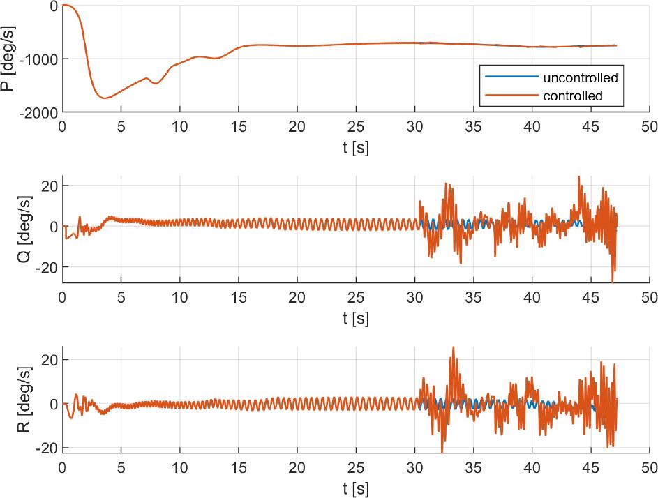 The absolute value of the roll rate increases in the active portion of the flight (when the main motor operates). The minus sign in the first plot in Figure 7means that the HSUAV rotated counterclockwise when looking from aft. For the controlled flight, the oscillations of pitch and yaw rate signals after 30 s result from the firings of lateral motors.