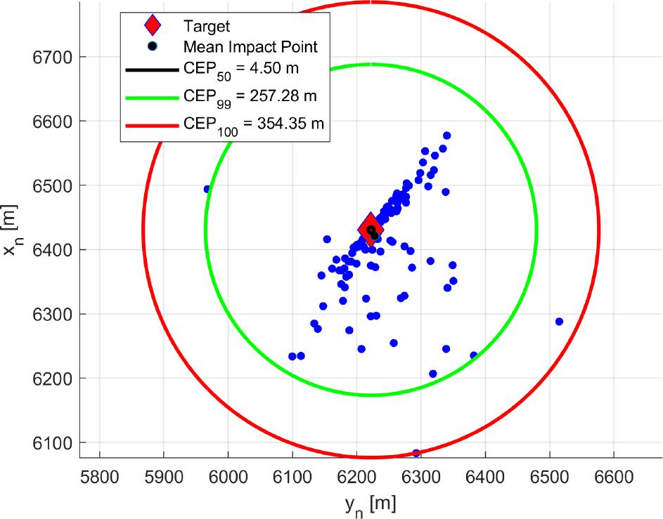 There is a systematic offset between the mean point of impact (MPI) and the target. With the control system applied, CEP50% decreased to 4.50 m. That means using a control system reduces the impact point dispersion (measured using CEP50%) by approximately 35.83 times. The location of MPI coincides with the target. This is important from a practical point of view because the unintended collateral damage can be minimized.