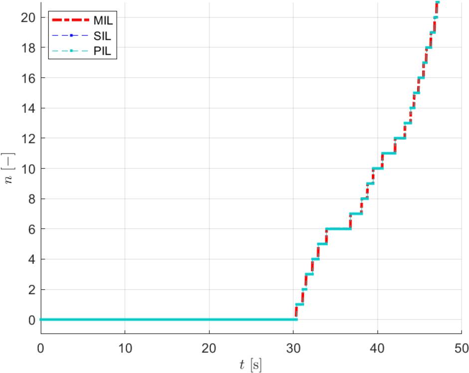 Next, the C code was generated, and SIL simulations occurred. Finally, the obtained C code was implemented on the target hardware with ARM Cortex M4. The PIL simulations were evaluated, and the obtained results were compared with MIL and SIL. The comparison of outputs from the controller implemented in Simulink and using C code is presented in Figure 12. The abovementioned figure illustrates the number of firing commands obtained from the original model in Simulink and from the SIL and PIL simulations. In the ideal situation, lines should coincide with each other. Then, the original Simulink model and C code would be numerically equivalent. In practice, due to numerical rounding errors, the model and C code are numerically similar but not perfectly identical.