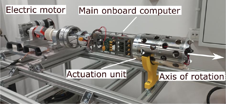 The main computer electronics were powered by the onboard rechargeable lithium polymer battery (12 V) integrated with the control system. The electric motor that drives the stand was connected to a different power source. The remaining elements (main solid propellant rocket motor and nose section) were removed because they are separate units (not neces-sary in the experiments). The developed control algorithm was implemented in the onboard computer.