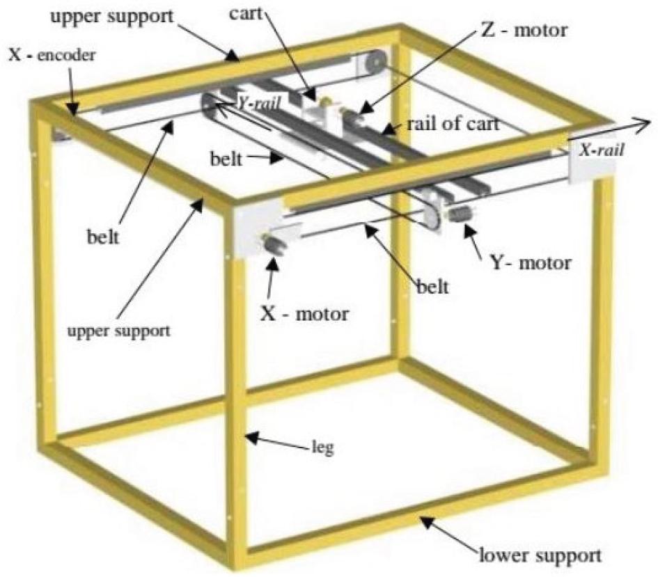 The force used to move the load is generated by three 24 V DC PWM controlled motors. The actual position of the load is measured by 5 high accuracy incremental encoders in 5 dimensions, which are positions along X-, Y-, and Z-axes, as well as angular deviations between the lifting rope and Y-axis, and between the negative direction on the Z-axis and the projection of the lifting rope onto the XZ plane.