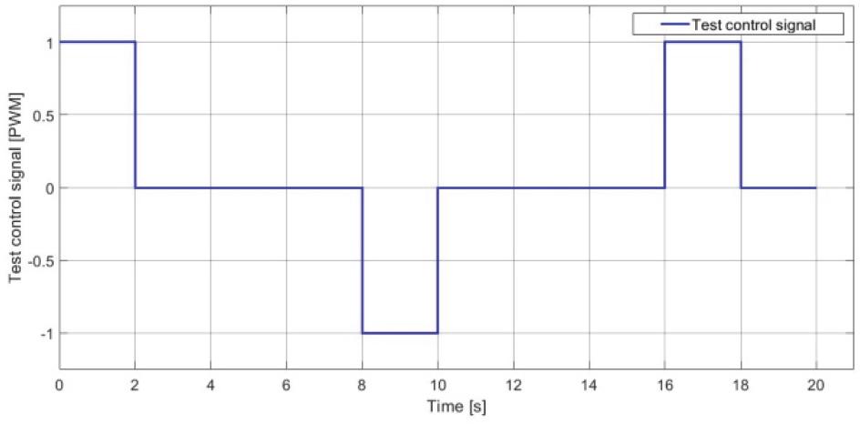 The state space model has been implemented in Matlab environment. Before starting the synthesis of the control system, the simulation tests were performed. The test signal was designed as shown in Fig. 2 and set for all control signals simultaneously to verify the behavior of the 3D crane. The results are shown in Figs. 3–4.