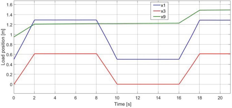 Moreover, the initial conditions for the position of the load were defined: x1p = x3p = 0.3, x9p = 0.95, where xip is the initial condition for the i-th state variable, i=1,…,10. ll other initial values of state variables in the 3D crane model have been assigned with zero values.