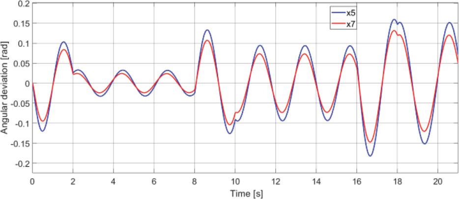 In the last variant, the values of proportional gains for PID alpha and PID beta controllers were increased. In addition, the derivative gain was assigned. Thanks to its positive influence on the transient states, the system is characterized by the best total IAE and ISE indicators among all proposed variants of PID controllers.