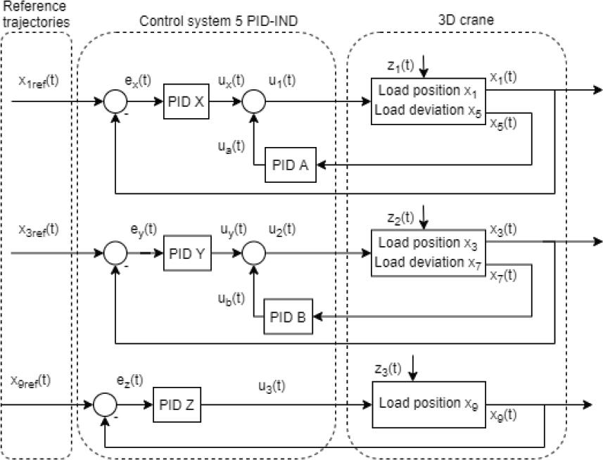 The first proposed control system consists of 5 PID-IND controllers (see Fig. 5) where three of them are responsible for controlling the load in 3D and the remaining two compensate for the load deviation.