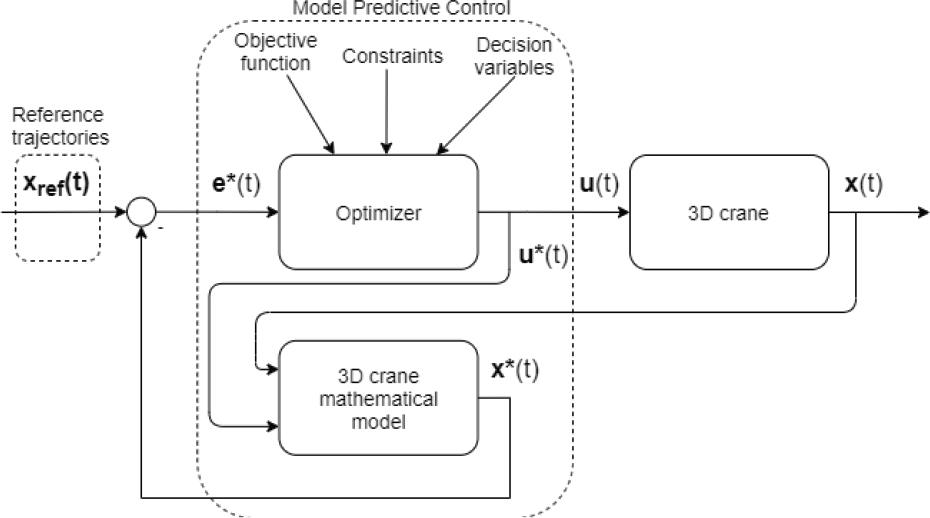 To achieve this goal, it uses the existing mathematical model of the crane, applying future controls to the system and calculating its predicted outputs. After finding the best solution, the first calculated controls are set at the controller output. Then the whole procedure starts again, using new system state values and setpoints [12].