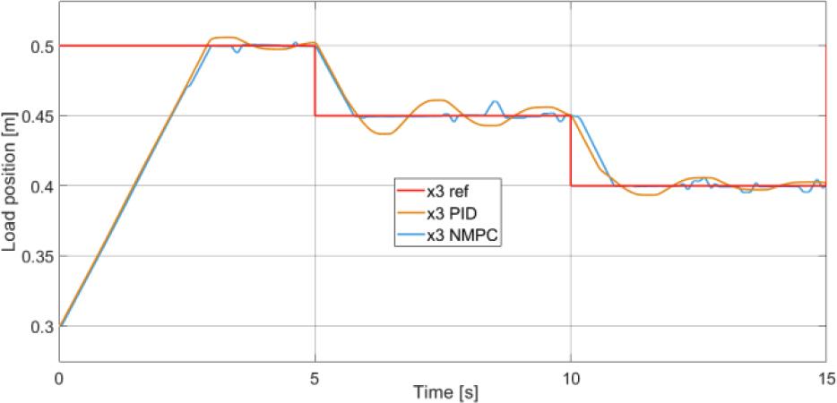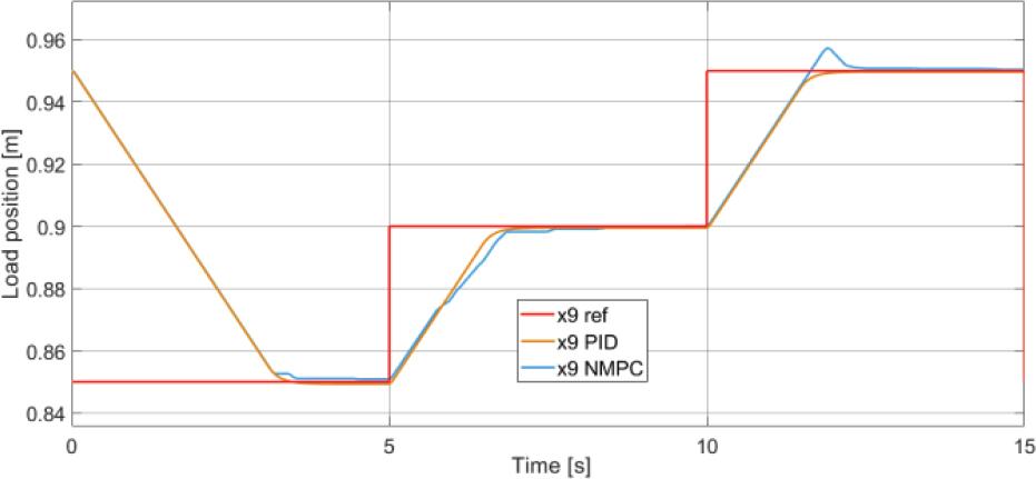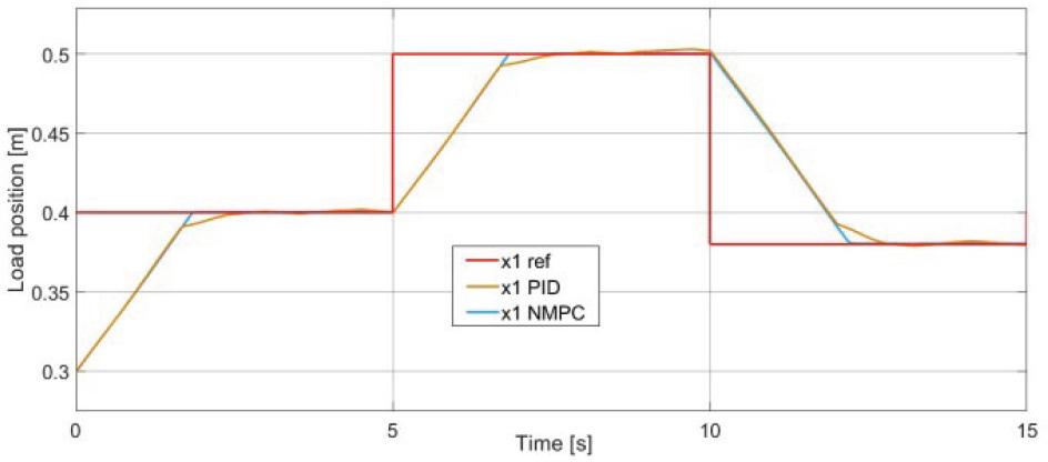 For x3, the PID control system gently falls into slow oscillations in order to control the load deviation, while the NMPC does less frequent and more dynamic counteractions - the system returns to the desired position faster. For x9, the systems work in a quite similar way until the last set values are reached. Then the NMPC controller generates an overshoot and returns to tracking the set value together with reaching the x1 reference position, while the PID structure reaches the position without such actions.