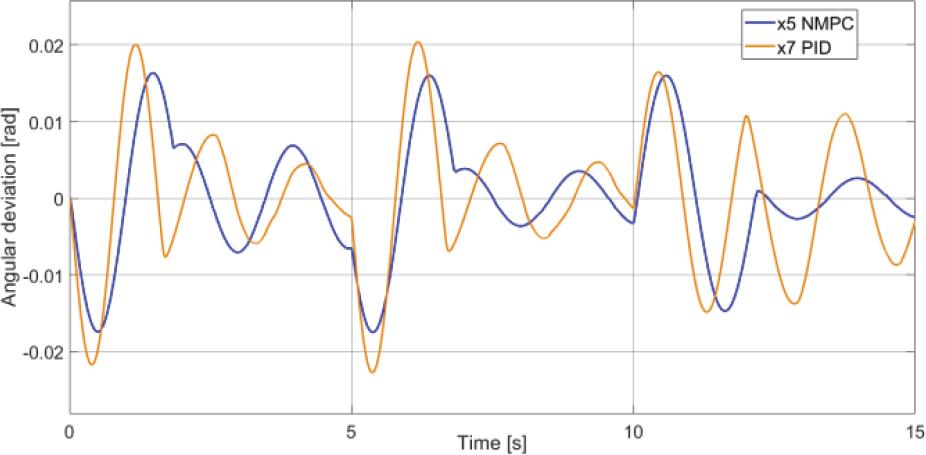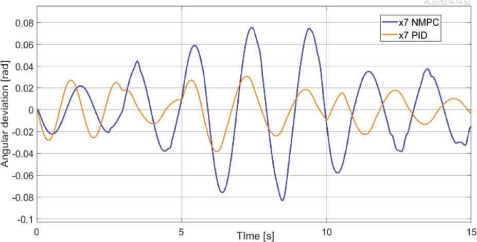 For x7 deviation, NMPC performs much worse than the PID control system, as can be seen in Fig. 11. It can be stated that the NMPC tries to counteract this deviation only for the last set values. At the same time, the PID control system tries to control x7 throughout the entire duration of the control.