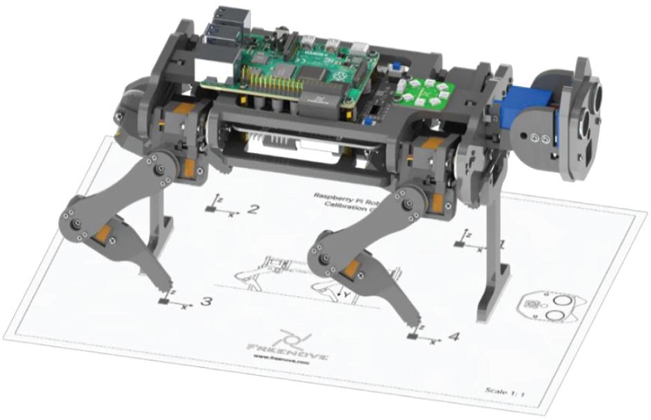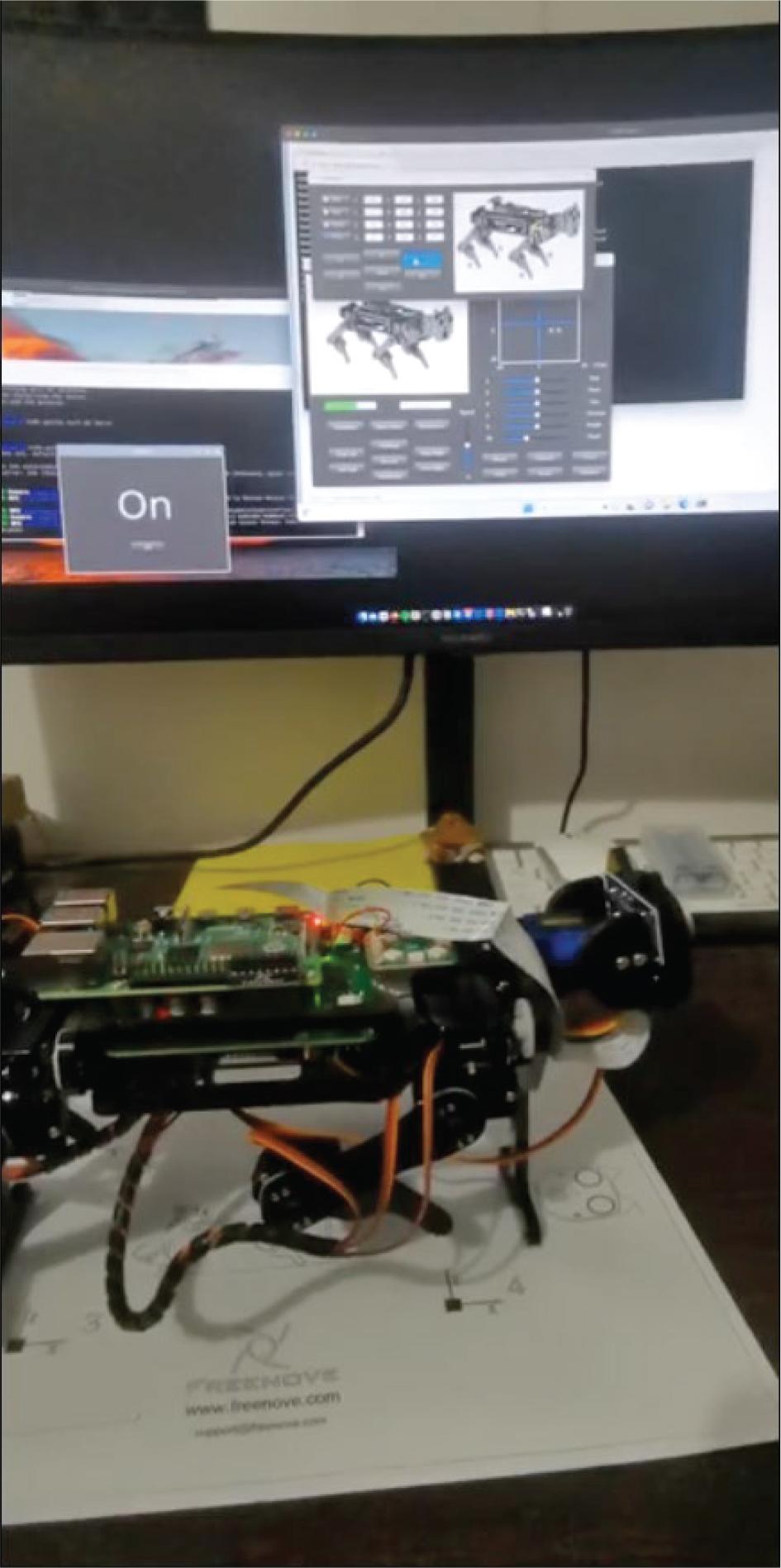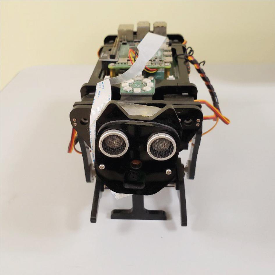 In this section, we describe the particular quadruped robot utilized in this research work. The Robot Dog Kit FNK0050 is one of the models from Freenove, which is a quadruped design with open code that is compatible with Raspberry Pi. It has an acrylic light structure with several sensors, such as a camera, an ultrasound sensor, a gyroscope and an accelerometer. The robot has a total of 12 degrees of freedom, which makes it an ideal system for low-cost robotic applications. Figure 1 shows a side-view of the robot dog after assembly. Figure 2 depicts a front view of the robot.