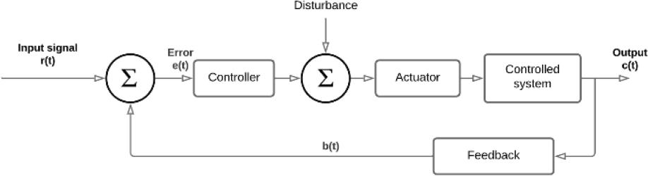 Controlling the stability of quadruped robots is very important for several reasons: stability will contribute to reduced likelihood of falling, robustness against external perturbations, energy efficiency and improved performance. In addition, controlling the motion of the robot in following a trajectory to achieve a particular goal is very important. In this paper, we are addressing this last problem by providing the robot with a controller that will make the robot autonomously move to achieve a goal. Figure 3 illustrates the control problem, which basically consists of reaching the value of an input command starting from an initial point. In Figure 4, we illustrate how disturbances can affect the behavior of the controller in the closed feedback loop.