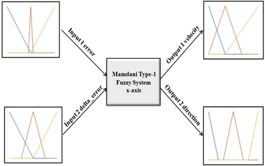 The fuzzy PD controller for the x axis is structured as illustrated in Figure 7, containing two inputs and two outputs. The first input is the error, and the second input is the change of the error called delta_error. The first output is the velocity of turning, and the second output is used to control the direction. The fuzzy system is of type-1 Mamdani form.