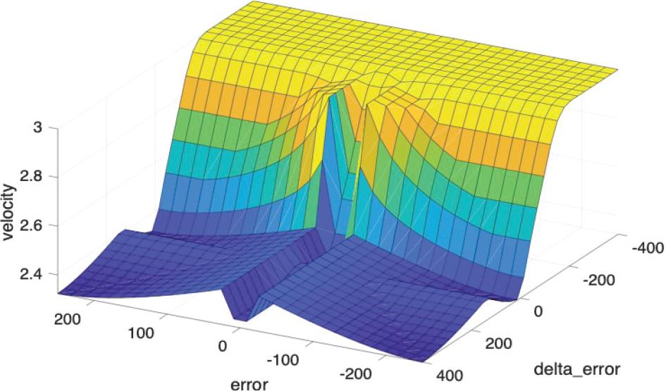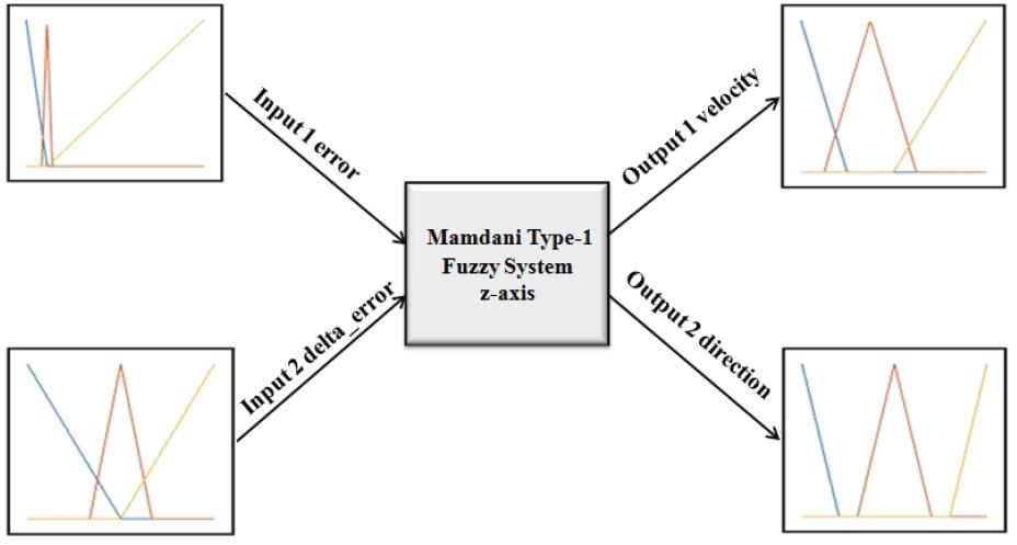 The fuzzy PD controller for the z axis is structured as illustrated in Figure 9, containing two inputs and two outputs. The first input is the error, and the second input is the change of the error called delta_error. The first output is the velocity of motion in the z axis, and the second output is used to control the direction. The fuzzy system is of type-1 Mamdani form.