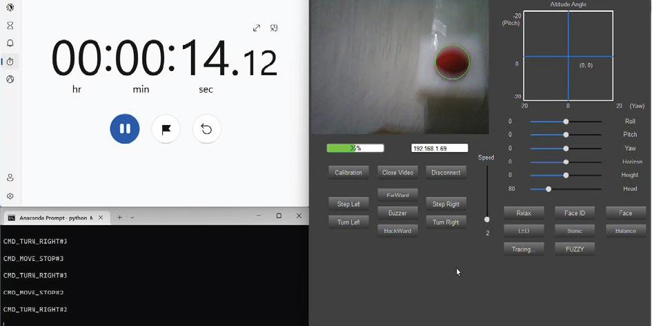 We performed 30 tests with a distance of 80 cm and the objective positioned in front of the robot, and in all cases, the robot reached the objective with an average time of 13.4796 seconds. The acceleration oscillated between 2 and 5, and the velocity between 2 and 3. The main advantages of the fuzzy PID controller were the dynamic adjustment of velocities and the adjustment to the position of the objective in the x axis, which enabled better movement of the robot, as shown in Figure 12.