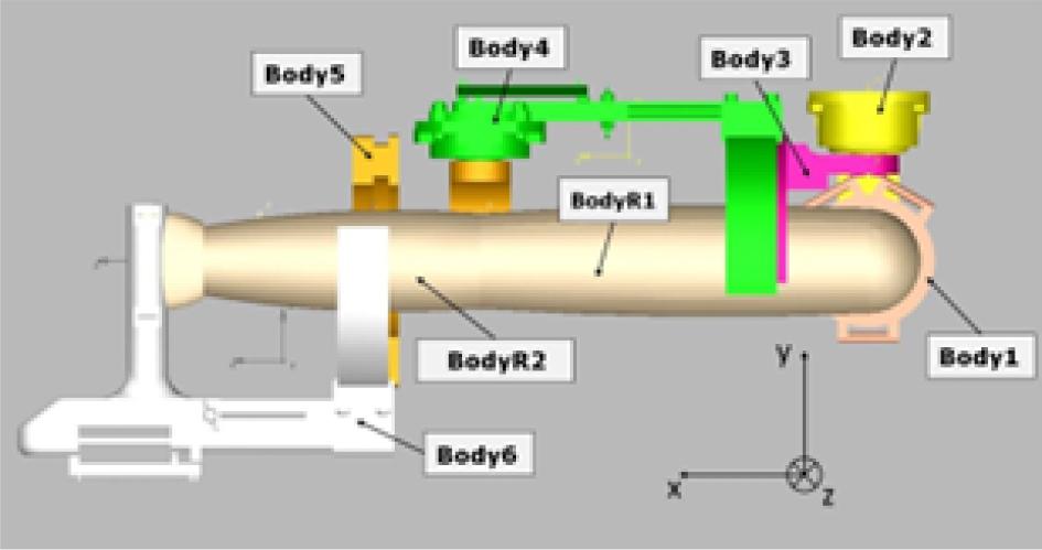 Mass parameters of the multibody model bodies (Iqq – main inertia moment along q axis)