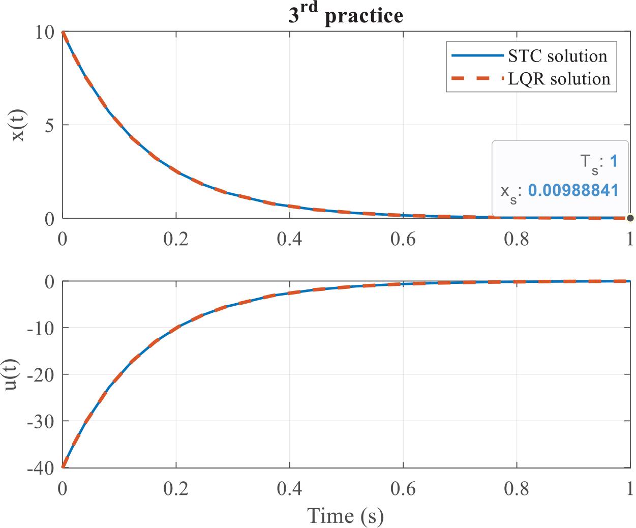 For the four possible scenarios, three practices are defined and tested under various conditions. In all practices across all scenarios, the selected or calculated settling time and settling point are accurately achieved. The STC is compared with the LQR and P controllers, and the cost function calculations indicate that the STC achieves the same optimal results as the LQR while performing significantly better than the P controller.