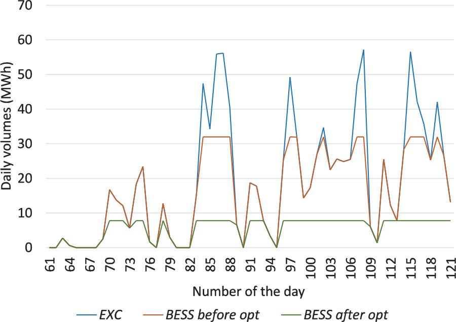 Figure 1 shows the daily amount of excess electrical energy of the solar power plant, the amount of electrical energy transfer using the energy storage system before optimization (with useful energy capacity at the level of 32 MWh) and after optimization (with useful energy capacity at the level of 7.8 MWh) for March and April of the year studied.