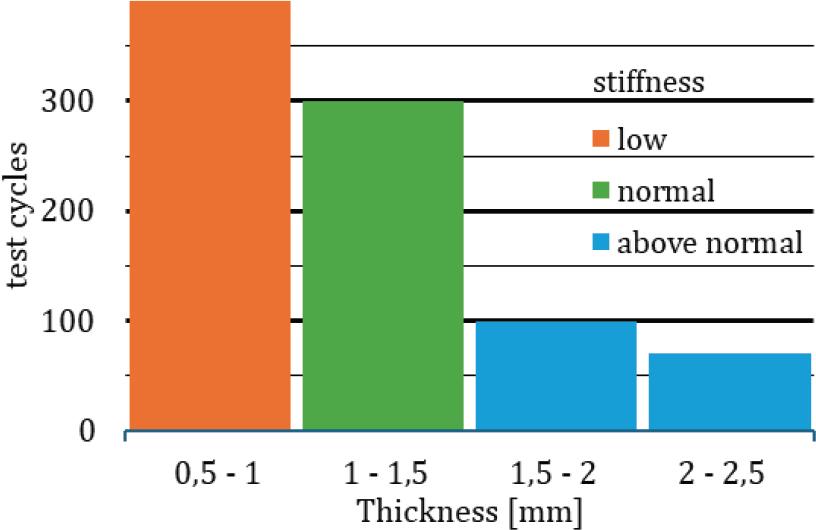 | Primary design second iteration (band thickness test) | −180 to 180 deg | Cyclic manual full extent deformation | Thicker bands (1.5 mm to 2.5 mm) show better stiffness but break quickly (after 70–100 cycles), thin bands (0.5 mm to 1 mm) don’t break (>300 cycles) but are unstable. Optimal thickness is between 1 mm and 1.5 mm(breaking occurs at approx. 300 cycles) |