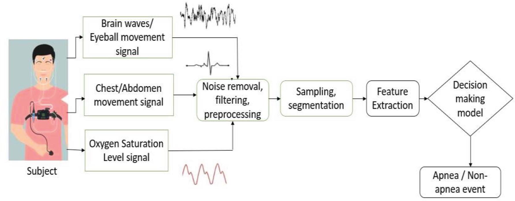 Another popular way to deal with sleep apnea (SA) is to diagnose this disease at an early stage with machine-learning (ML) and deep-learning (DL) methods. Signals recorded from suspected patients’ body like electrocardiogram (ECG), SpO2, and EEG are analyzed through these techniques to make predictions about the severity of the disease. Figure 1 shows a detailed workflow for SA diagnosis at sleep centers.
