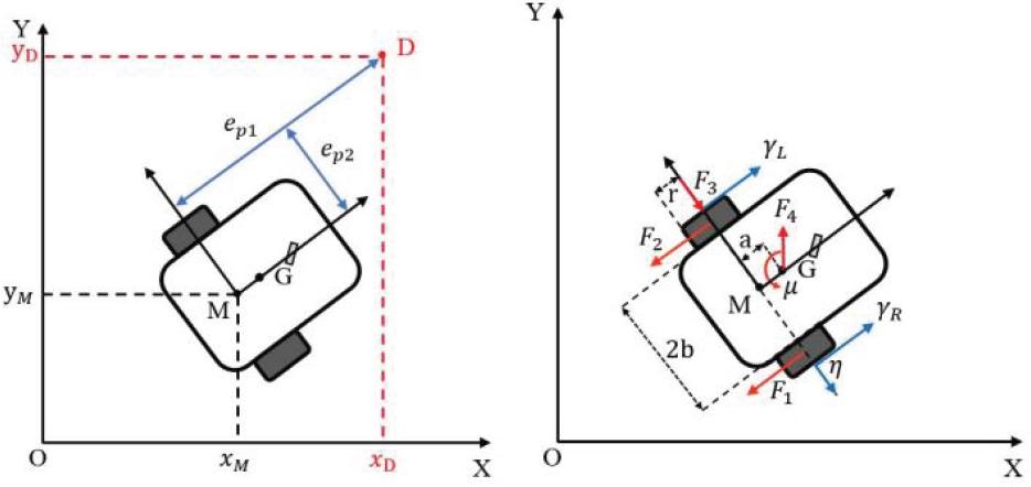 The robot parameters are defined and shown in Fig. 1. In which, G (xG, yG) is the center of mass of the WMR platform, M (xM, yM) is the midpoint of the driving wheels, D (xD, yD) is the desired position; θ is the orientation of WMR; 2b is the width of WMR; r is the wheel radius; ep1, ep2 are the position errors between M and D in the MXY coordinate; a is the distance between M and G; γR,γL are longitudinal slip factors of the right and left driving wheels, respectively; η is the lateral slip factor along the wheel shaft; I, B, Q, C and G are weighting matrices and vectors in WMR dynamic, which are defined in details in [33]: