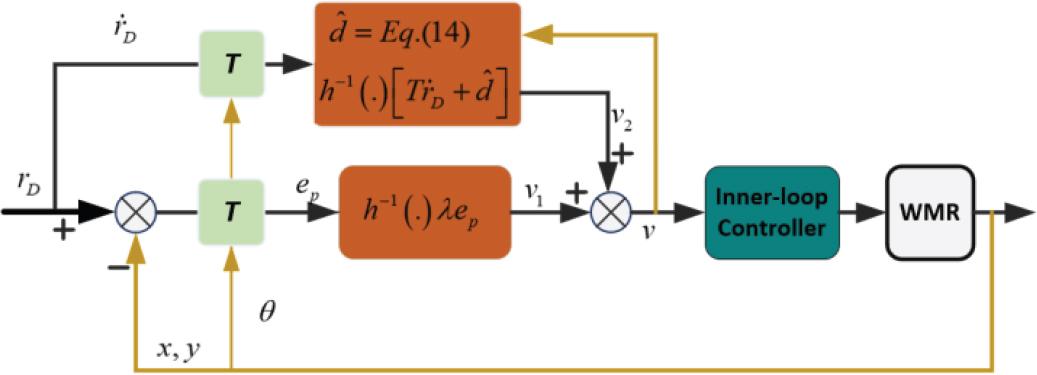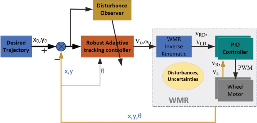 Similar to the approach in [33], the control scheme for the WMR consists of two loops arranged as a cascade control system, as shown in Fig. 2. The outer loop is responsible for controlling the robot’s position. This controller incorporates a disturbance observer to compensate for disturbances, system uncertainties, and model errors. Meanwhile, the inner loop manages wheel speed control, ensuring that the wheels follow the speed commands generated by the outer loop.