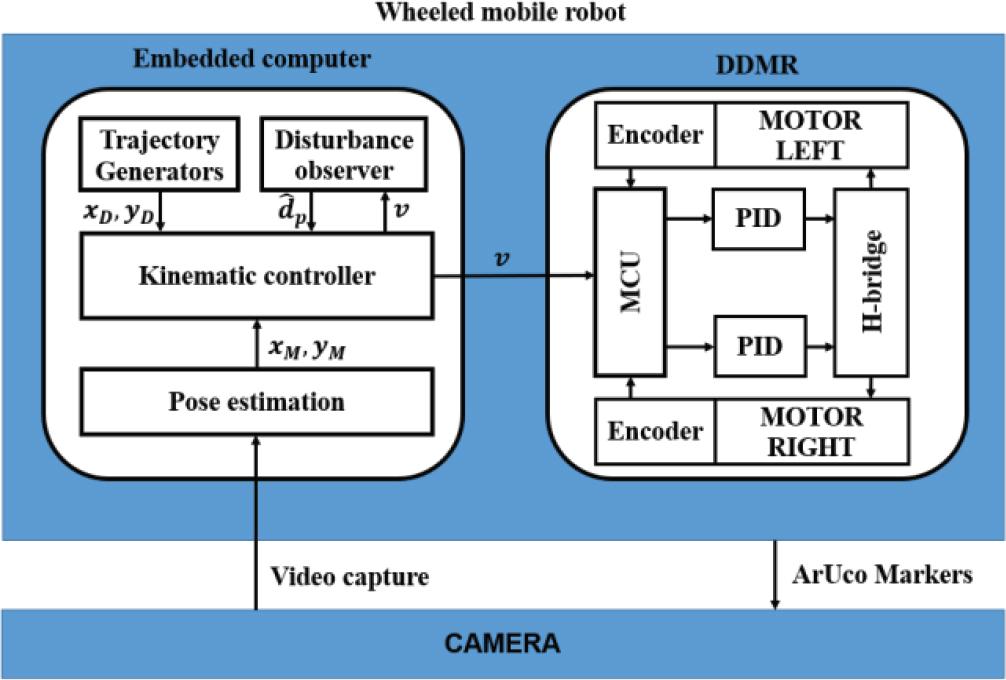 The block diagram for a WMR experimental control setup is shown in Fig. 4. In this setup, the outer loop controller is executed on the embedded computer. In which, the WMR position and orientation is determined by an ArUco marker and vision method. Based on these measurements, the adaptive controller with disturbance observer described in (19) is implemented to find the reference signals for the inner loop controller. The inner loop controller is executed on the microcontroller to control the rotational speed of the right and left driving wheel of robot.