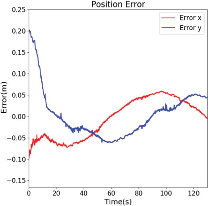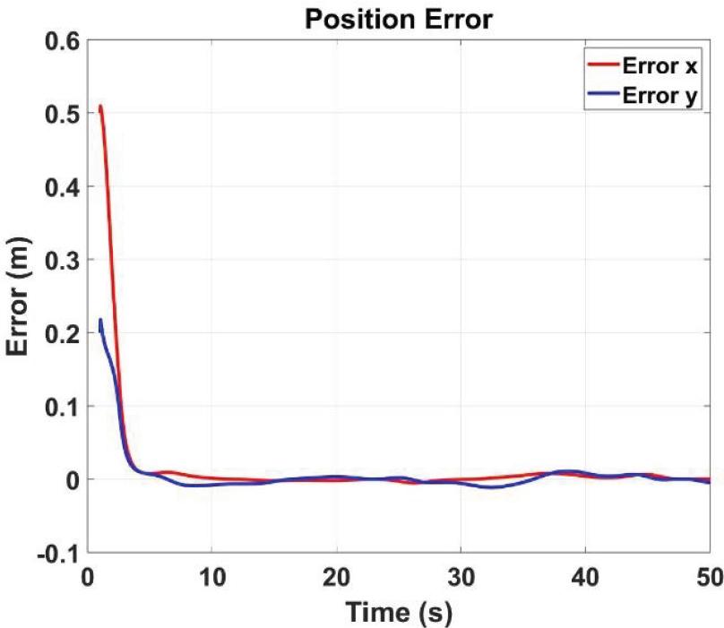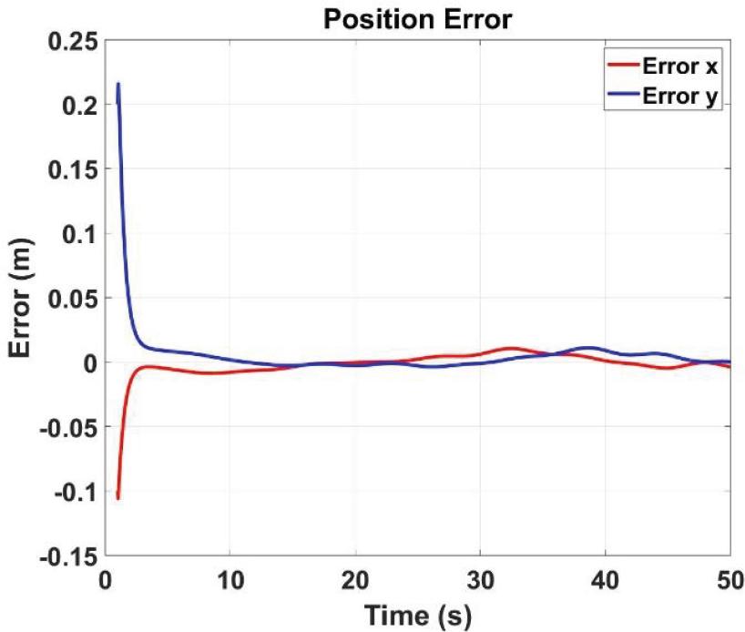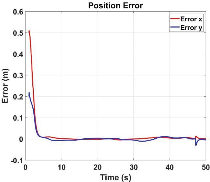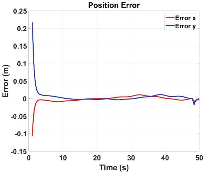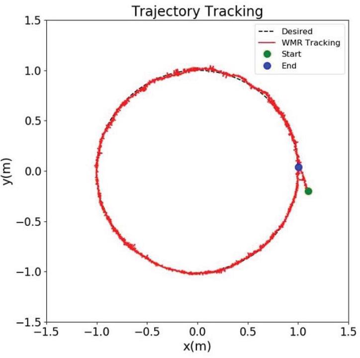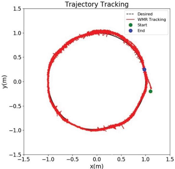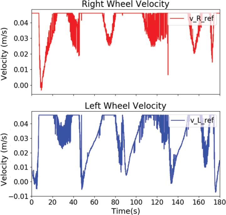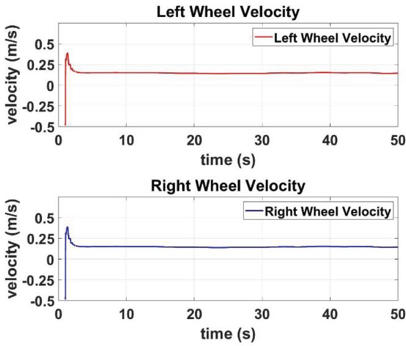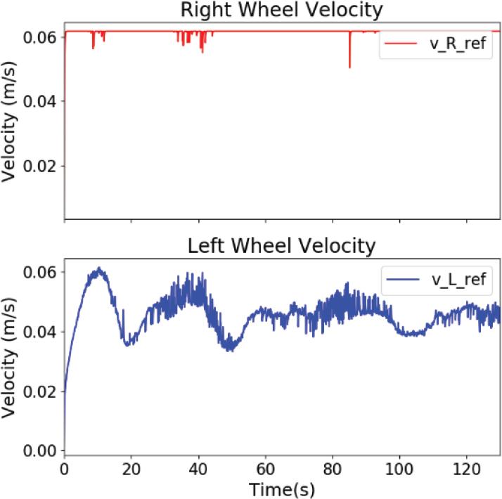 Fig. 24 through Fig. 27 present the control results obtained from the real-world experiments. The results demonstrate that the controller successfully guides the robot along the circular trajectory (Fig. 24) with a small steady-state error of less than 3 cm (Fig. 25). The controller’s output signals, represented by the wheel velocities, are shown in Fig. 26. For the circular trajectory, the right wheel appears to maintain a constant speed of 0.06 m/s, while the left wheel speed adjusts to follow the trajectory with smaller speed.
