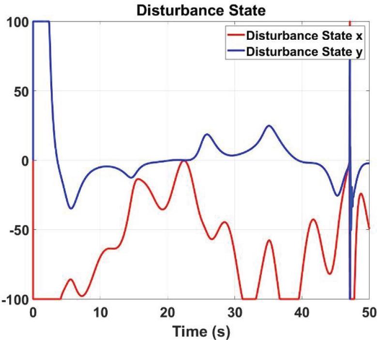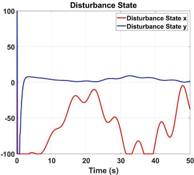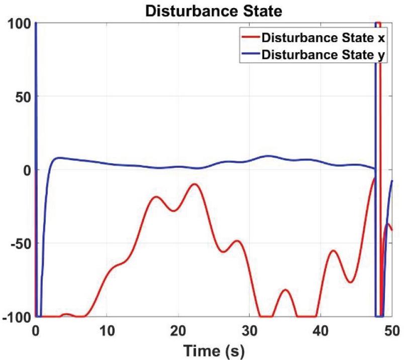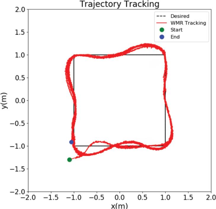 Similarly, the control results for the square trajectory are shown in Fig. 28 through Fig. 31. Fig. 28 illustrates the tracking performance for the square trajectory. It can be observed that there is an overshoot when the reference changes its orientation, which occurs due to the robot’s inertia and reference speed, causing it to continue moving forward until it adapts to the new orientation. Fig. 30 depicts the wheel speeds, showing that the left wheel speed decreases rapidly to accommodate the sudden change in the reference trajectory. The disturbance estimation results are presented in Fig. 31.