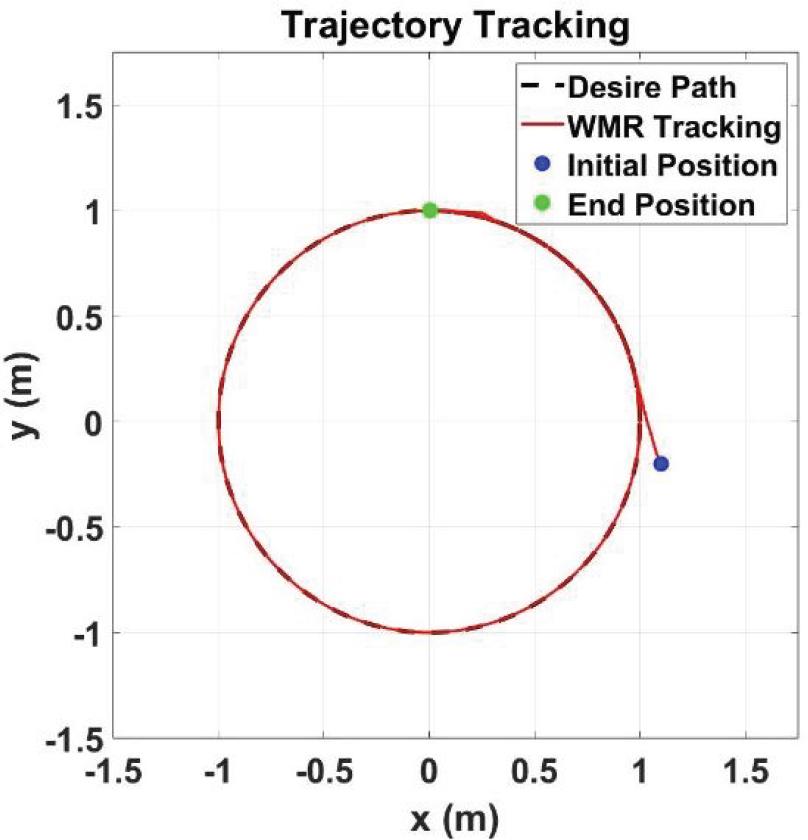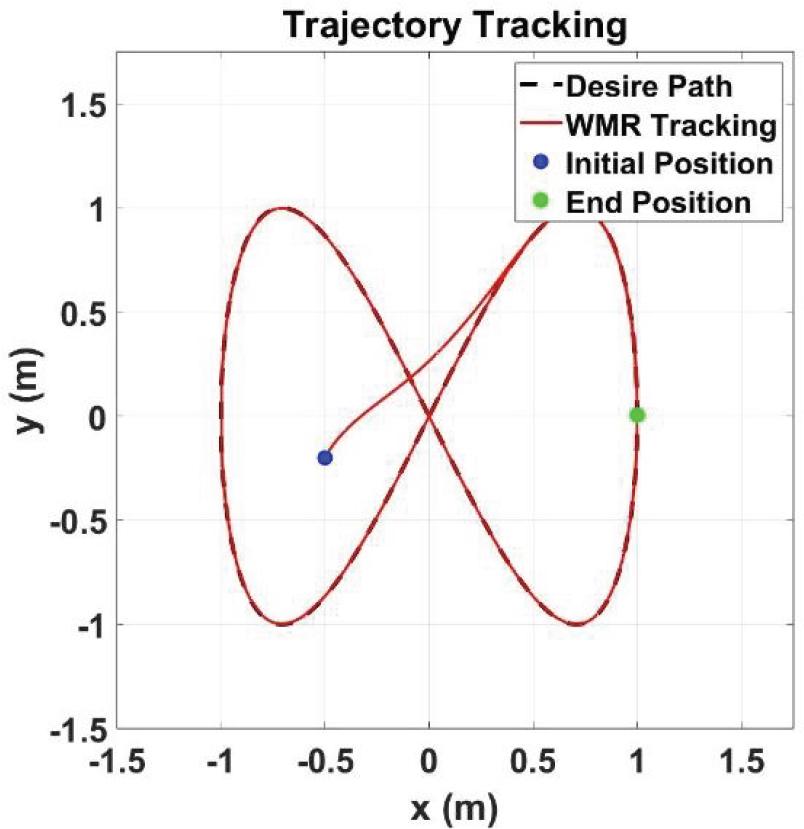 In the simulation, the WMR model and the proposed controller were implemented in MATLAB Simulink. Two trajectory cases were used to verify the simulation results: an eight-shaped trajectory and a circular trajectory. The mathematical expression for the eightshaped trajectory is presented in Equation (23), while the circular trajectory is described in