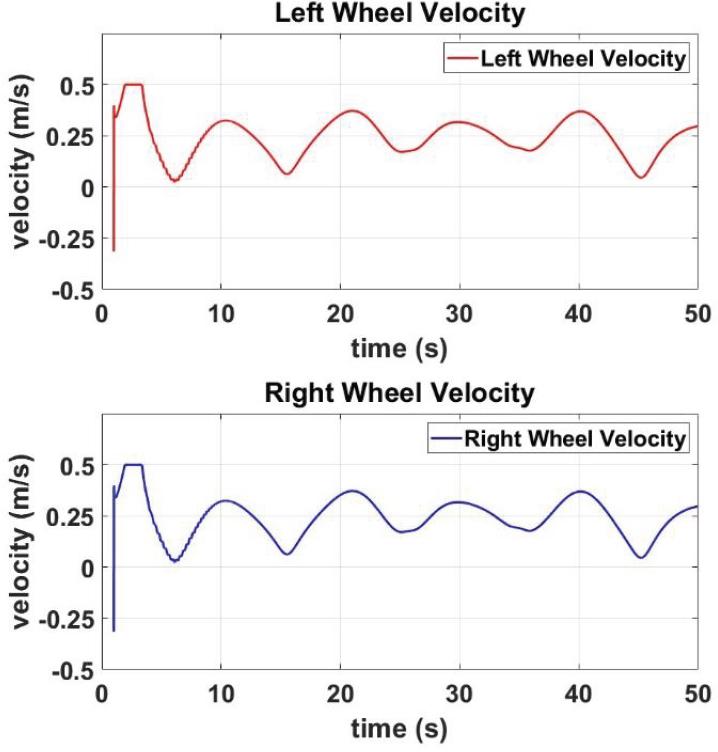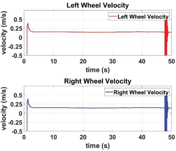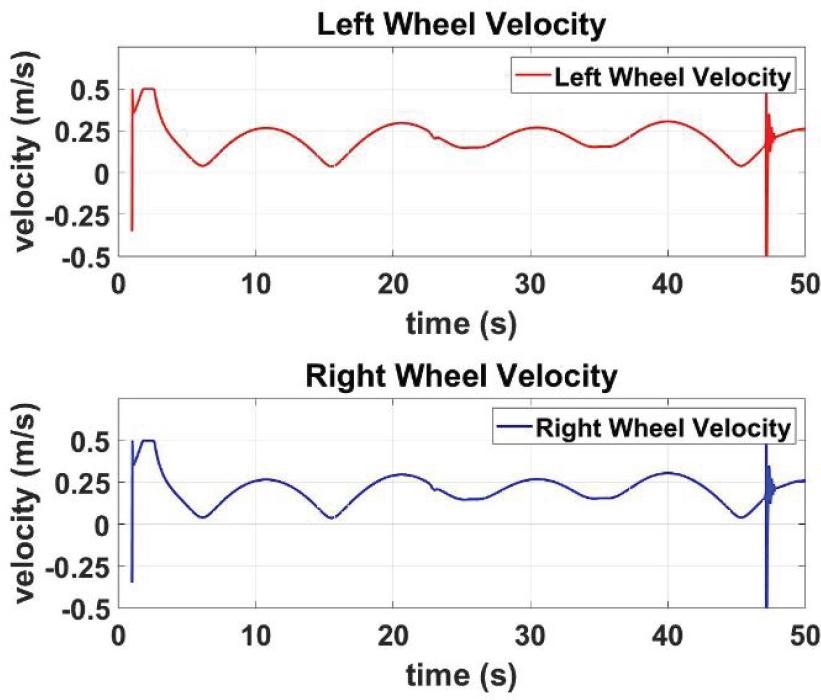 It can be observed that the wheel velocities and estimated disturbances are stable and smooth with the proposed controller, whereas the controller in [33] exhibits large variations, particularly from the 47th second onward, as seen in Fig. 15, and Fig. 23. These variations may lead to system instability.
