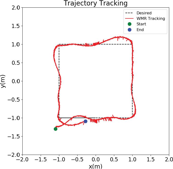 Finally, the controller is verified in long-time and load conditions. In this test, the robot carries a 5 kg load and track to circular and square trajectories in 4-loops. The tracking results are shown in Fig. 32 and Fig. 35. It can be seen that the controller successfully adapts to varying load conditions. Furthermore, the control performances are kept stable in all loops, this demonstrates that the controller is stable and robust over time. The control signals with respect to trajectories, are displayed in Fig. 34 and Fig. 37. They show that the wheels’ speeds are similar after each cycle. This proves the robustness and stability of the controller.