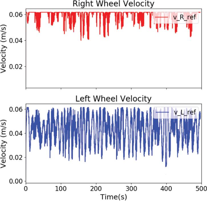 Reference speeds of driving wheels with respect to Eight-like trajectory generated by controller from [33]