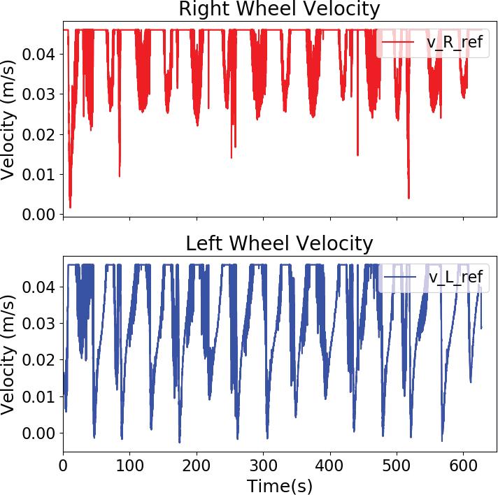 Reference speeds of driving wheels with respect to circular trajectory generated by controller from [33]