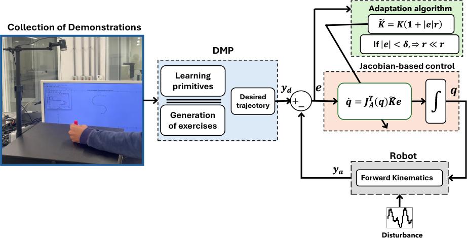 The rest of this paper is organized as follows: After the introduction, Section II details the LfTD framework. This section describes the process of demon-stration collection, DMP computation, exercise generation, and feedback control implementation. Based on this framework, Section III presents its application on a simulated robotic manipulator, along with a discussion of the results obtained. Lastly, Section IV concludes with our main findings and directions for future research.