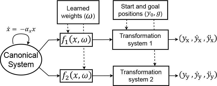 Schematic diagram of a two-dimensional DMP. This diagram illustrates how learned weights (ω) model trajectories, adjusting the motion from the start (y0) to the goal (g) positions
