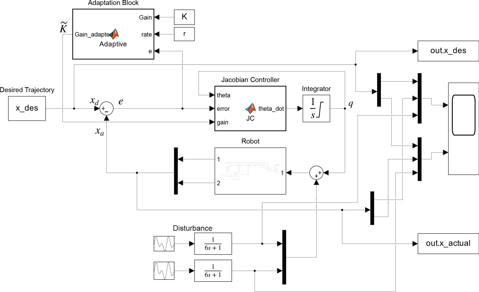 Here, ẏd represents the time derivative of our desired trajectory, while the error e represents the difference between the desired and actual end effector positions (yd – yr). Additionally, a diagonal positive definite matrix K ∈ ℝ2×2 is introduced to ensure stability and convergence.