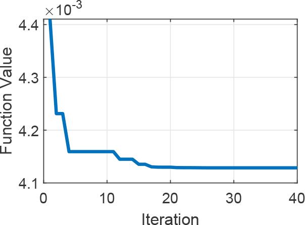 After capturing the trajectory, the generated motion in Cartesian coordinates was fed to the DMP for calculating the target forcing term f, with the aim of learning, reproducing, and generalizing the captured motion. Sixty basis functions were used to balance accuracy and computational efficiency, allowing the system to effectively capture motion details without overfitting. This configuration was refined through careful evaluation. Utilizing locally weighted regression and the sixty equally spaced basis functions, as depicted in Figure 5, the system successfully learned the weights for each degree of freedom (DOF), which are crucial for reproducing the captured motion. Particle Swarm Optimization (PSO) was used to optimize the DMP parameters α and β. A swarm of 16 particles was run for 40 iterations, resulting in convergence within 51.61 seconds and an objective function value of 0.0041. The search space for the parameters was limited to [0, 0] and [30, 30]. The optimal values found were α = 22.23 and β = 6.64, which improved the model’s trajectory accuracy. Figure 6 illustrates the Trajectory Error Function, showing the reduction in error over time. By efficiently learning the weights and optimizing the parameters, the DMP was able to accurately learn and reproduce the trajectory with good precision.