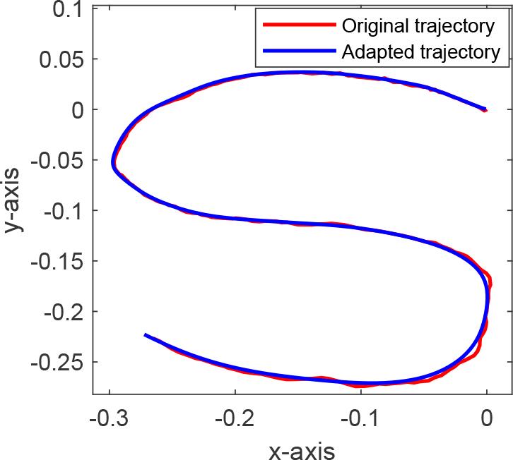 The ability of the DMP to generalize to new goals was examined by modifying both the initial and final points of the demonstrated trajectory while maintaining the learned weights, as illustrated in Figure 9. The original trajectory, with initial and final points at [0 0]T and [–26.5 –22.6]T cm, respectively, was adapted to a new trajectory with initial and final points at [2.8 2.0]T and [–32.3 –29.6]T cm, respectively.