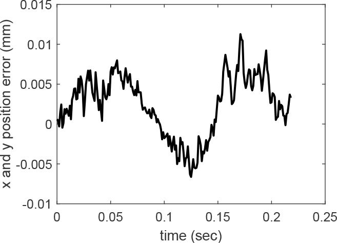 One example of the reproduced demonstration is depicted in Figure 7 where it is compared with the original demonstration which have starting and final points at [0 0]T and [–26.5 –22.6]T cm respectively. The DMP successfully reproduced the motion with negligible error in both x and y positions with the error variation depicted in Figure 8. This error, though negligible, is primarily attributed to the approximation of the non-linear forcing term and the tuning of the DMP parameters.