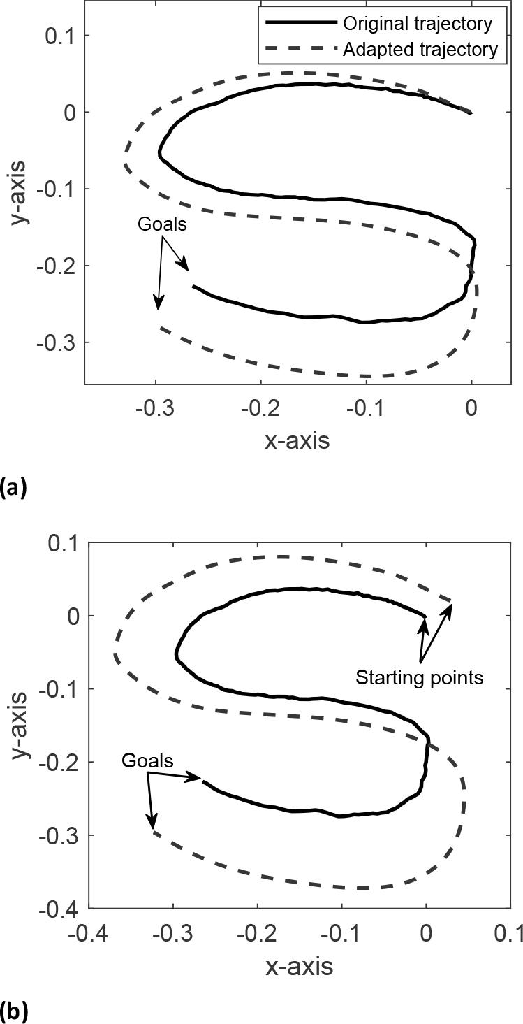 Adaptation of the demonstrated trajectory to changes in starting Points and goals. Figure (a) shows the trajectory adapted to a new goal, maintaining the original starting point. Figure (b) demonstrates how both the starting point and goal are changed