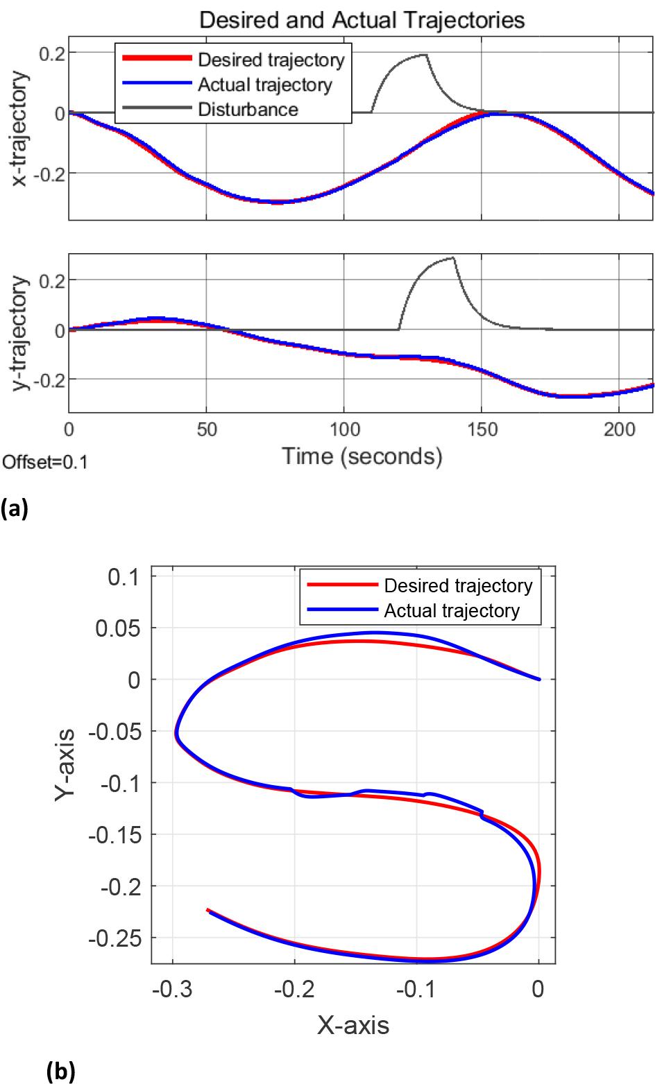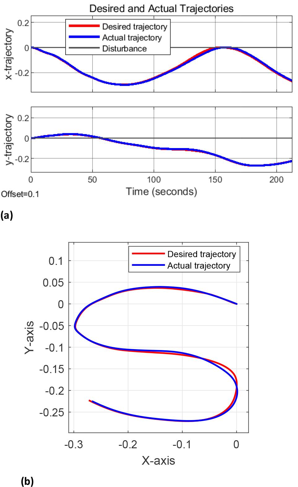 The deviation between the actual and desired end-effector trajectories executed by the robot is illustrated in Figure 10. This figure shows that the robot accurately tracks the desired trajectory throughout its motion. The simulation results further highlight the robot’s capability to maintain precise trajectory tracking in a 2D setting, providing an evaluation of the MRAC’s performance.