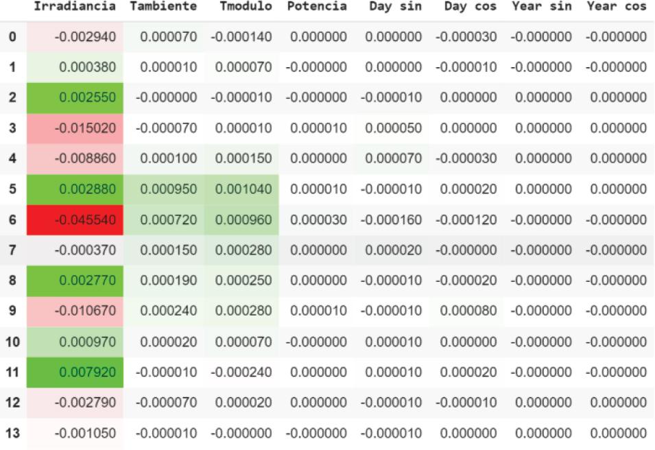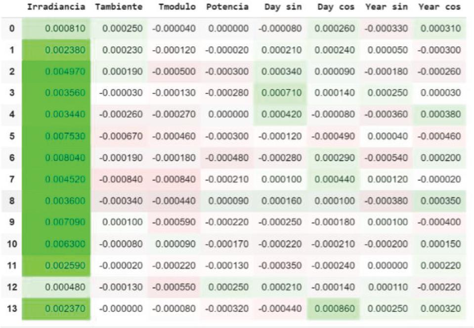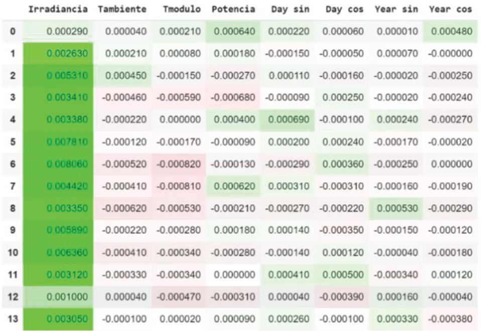 Integrated Gradient offers a different explanation from that obtained by the LIME and SHAP methods (Figure 4), but on the contrary, similar to that obtained with the Time Series Saliency, where “Irradiancia” is a variable that greatly influences the prediction, but depending on the day in the past, can have a negative contribution to the prediction. It should be noted that for this method the variable “Tmodulo” has the greatest importance for prediction.
