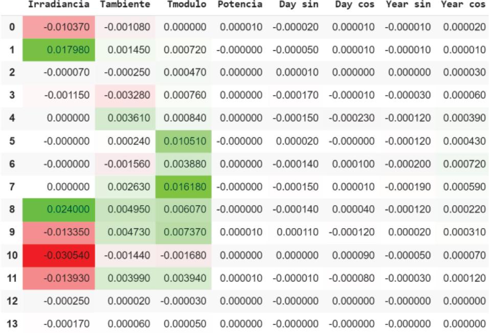 This network was trained with data from Cuban plants. For this research the data from the UCLV plant is used. Where after preprocessing 8 features are used for the network input: “Irradiancia”, “Tambiente”, “Tmodulo”, “Potencia”, “Day sin”, “Day cos”, “Year sin”, “Year cos”; as well as 14 days in the past; so the network receives a tensor with dimensions of (None, 14, 8). “None” represents the number of instances that you want to pass to the model.