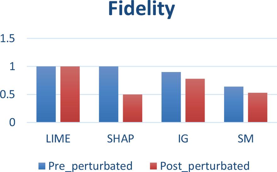 The comparison of the fidelity of the LIME, SHAP, Integrated Gradients and Time Series Saliency methods before and after perturbations, highlights the stability of LIME against changes in the data maintaining a perfect fidelity of 1.0, indicating that this method offers consistent interpretations and is robust to disturbances.